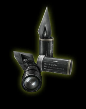Выстреливаемая камера наблюдения, передающая изображение в реальном времени на ОПСАТ и ваш КПК. Работает при любой температуре. Есть система электромагнитного видения, возможность ночной съёмки, панорамной съёмки и приближение. Возможность шумовых сигналов и выпуска слезоточивого газа. Камеры могут быть утилизированы, если газовый баллон не пробит. Повторный беспроводной захват сигнала возможен в пределах диапазона. (Двойной Агент)