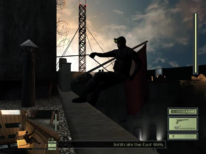 Fisher starts the mission on the roof of the East Wing of the Ministry's headquarters. Third Echelon operation coordinator Irving Lambert, having run the surveillance footage Fisher obtained from the 7th Tbilisi Police Precinct through ECHELON, has identified the man who took Agents Blaustein and Madison's subdermal implants: Russian mercenary Vyacheslav Grinko. Lambert tells Fisher to intercept Grinko in the parking garage for answers, and that if he is not at his car, then his driver, Hamlet, will be. He also stresses the need for extreme stealth: a laser grid is online in the building's courtyard, and since Third Echelon did not receive prior approval for this mission, it will be immediately aborted if Fisher triggers any alarms.