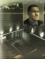 As Hamlet is about to relieve himself in a corner, Fisher grabs and interrogates him. Hamlet reveals that a conversation is going to take place between Grinko and Canadian hacker Philip Masse in a glass elevator overlooking the courtyard. Lambert orders Fisher to record this conversation, noting that he will first have to disable the laser grid to get into position. With these new objectives, Fisher returns to the hallway upstairs and enters an office further down. After shooting out the camera above the door, he learns from a computer inside that the grid can be disabled from a security terminal in the lobby of the South Wing.