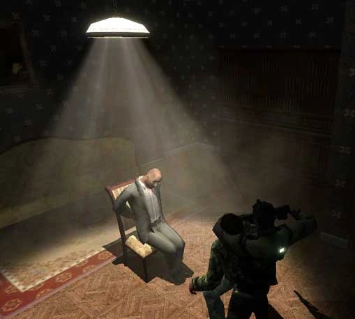- Despite Lambert saying that the sniper overlooking the courtyard is wearing night vision goggles, the goggles are not actually covering his eyes, but pushed up on his forehead. He will still act like he's wearing the night vision goggles, however.