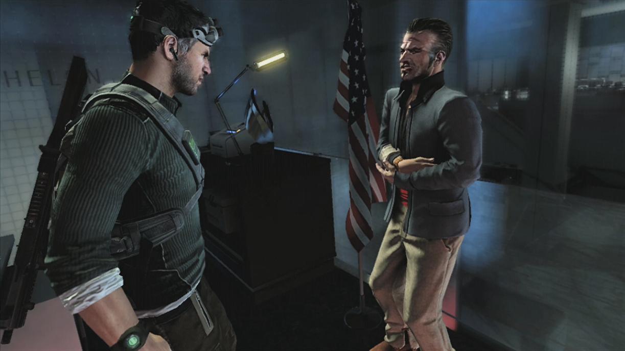 Sam is inserted in the lower parking garage by a black SUV driven by a Secret Service agent acting on orders from President Patricia Caldwell. Fisher pops open the back door, humorously letting Anna Grímsdóttir via radio transmission know that he 'smells like a spare tire.' Grím tells Sam that he'll have to sneak past the security in the garage, avoiding detection, and destroy two power transformers in order to breach the Third Echelon Headquarters. To destroy the transformers, Sam brought C-4 explosives with him to place on either transformer to make sure they are disabled for good. Utilizing stealth and covert tactics, Sam placed either C-4 on the two transformers and made his way to the central elevator, riding it up to the entrance of the Third Echelon Headquarters. A storm brews outside, with lightning flashing as Sam walked up to the front desk, where a receptionist was taking a call on the phone. She asks Sam what he needs, to which Fisher replies that he wants to speak to Tom Reed. The receptionist states that Reed is currently unavailable, and asks for Sam's name. Sam states his name, revealing that he used to work there just as he detonated both C-4s in the lower parking garage. The explosion sets off the central alarm system, and Sam takes the opportunity to jump the desk and enter the Third Echelon HQ offices after pushing through a few security guards.