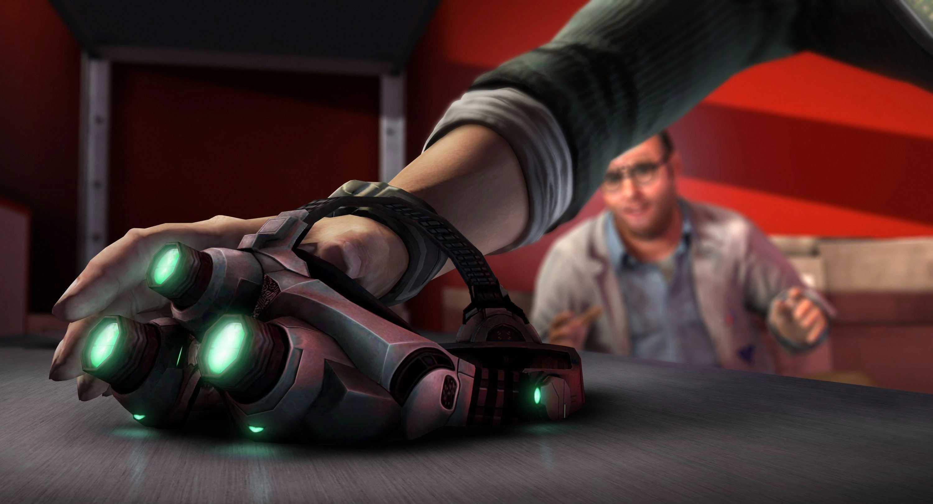 Sam now had to make his way to Grímsdóttir's contact, Charlie Fryman, a Third Echelon tech who was going to give him something important he'll need to reach Reed's office. After some resistance, Sam finds Fryman in the server room where they were set to rendezvous in. Meeting Sam, Fryman is almost unable to contain his enthusiasm as he tells Sam about how much of a legend he is, stating he's a 'big fan'. Sam flatly tells him that 'he's touched' and to get to the point, to which Fryman introduces the Sonar Goggles to Sam, stating how it's 'even better than the ones issued to the Splinter Cells.' Fryman tells Sam that these particular Goggles are specifically calibrated to pick up the laser security frequency that blocks the way to Reed's office. Sam thanks him, asking him if he'll be alright; Fryman assures Sam by stating that he'll be fine, he'll just tell the guards he was out to use the bathroom. With his new equipment, Sam makes his way to Reed's office - utilizing the Sonar Vision to detect the laser system utilized to detect intruders in the further areas.